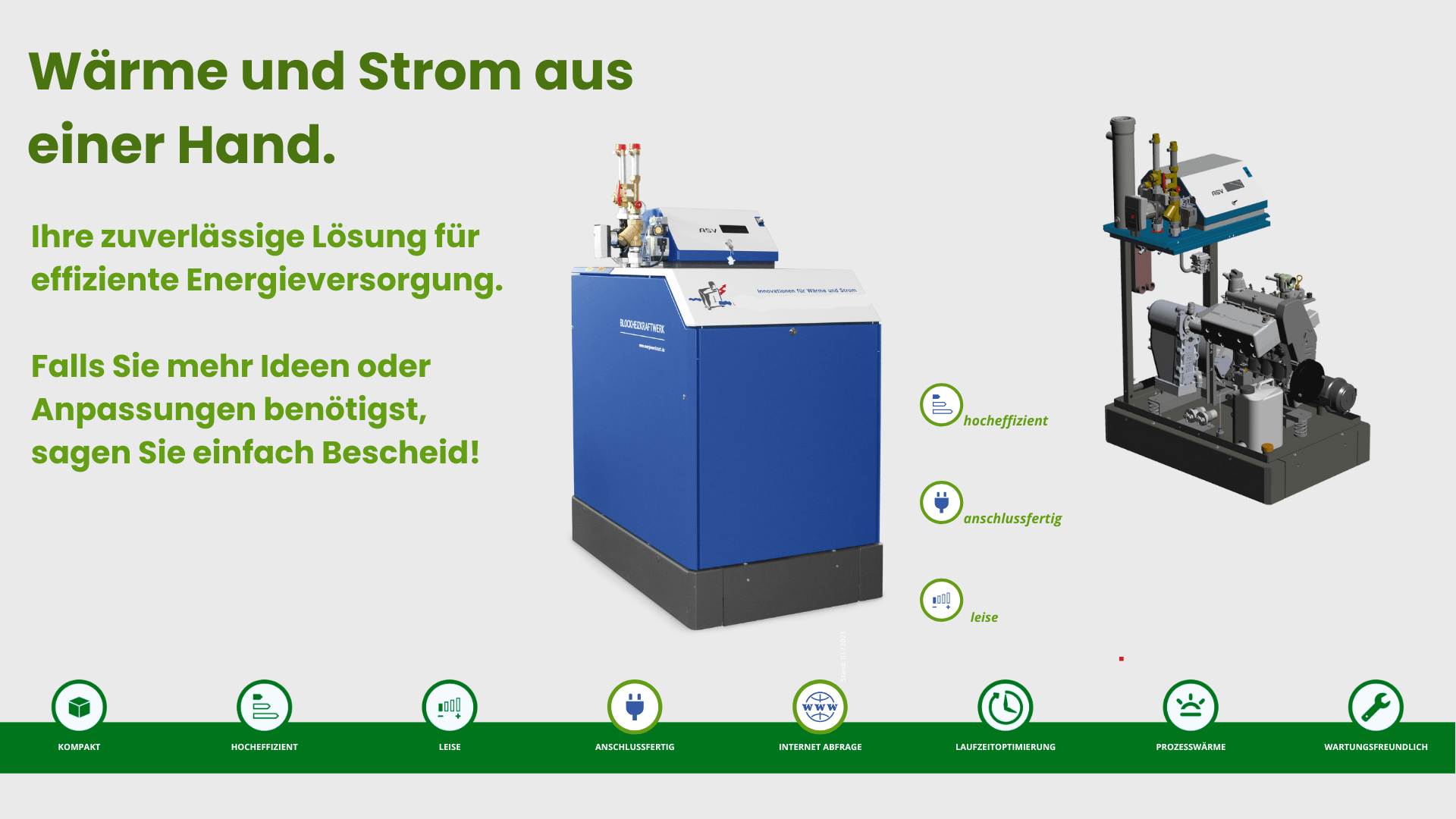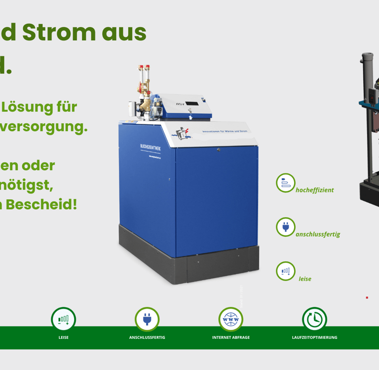 Erleben Sie Effizienz und Nachhaltigkeit mit den ASV-Blockheizkraftwerken! Unsere leistungsstarken und anschlussfertigen BHKW-Lösungen bieten Unternehmen die Möglichkeit, Energiekosten zu senken und gleichzeitig die Umwelt zu schonen. Mit kompaktem Design, leiser Betriebsweise und einem Gesamtwirkungsgrad von bis zu 105 % liefern die ASV-Modelle zuverlässig Strom und Wärme aus Erd- oder Flüssiggas. Fernsteuerung und einfache Integration machen sie zur idealen Wahl für eine zukunftsorientierte Energieversorgung. Setzen Sie auf die Power. Effizient, leise und sofort betriebsbereit!